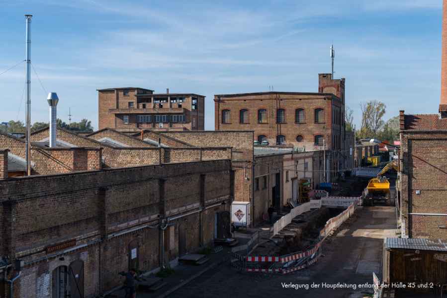 Noch bis voraussichtlich Mitte November wird entlang der Halle 45 die Versorgungshauptleitung verlegt und im Anschluss daran erfolgt die Herstellung der dortigen Hausanschlüsse. Ziel ist es im Dezember die Flächen zu asphaltieren, wobei im Bereich der Halle 45 gemäß Denkmalschutzauflagen gepflastert wird. Die Pflasterarbeiten erfolgen im nächsten Jahr.